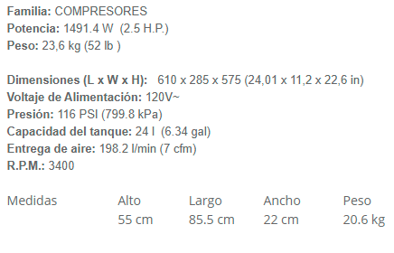 Es un motocompresor con un tanque de 24 l, y una potencia eléctrica de 2.5 H.P., ideal para trabajos en el hogar o en reparaciones sencillas que requieran aire comprimido, como son talleres de tapicería o carpintería