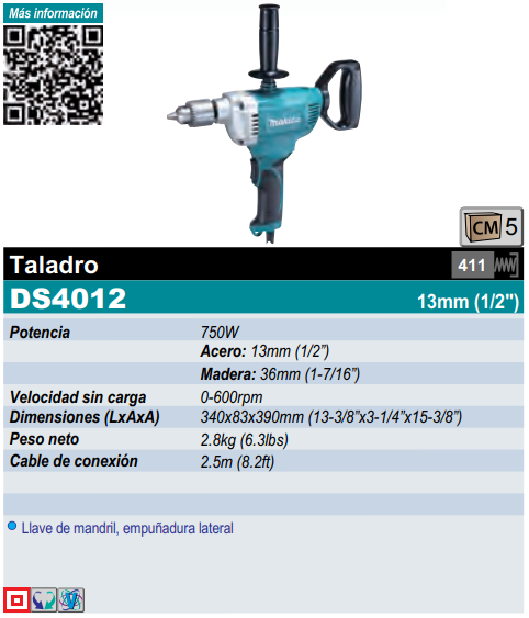 Taladro 1/2in VVR 0-600RPM Tipo espada 750W