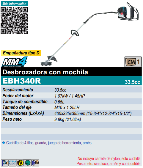 Desbrozadora 33.5CC (4T) 1.07 KW 1.4 HP tipo mochila