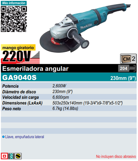 Esmeriladora 9in 6600RPM Lim. torque 2600W (220V)