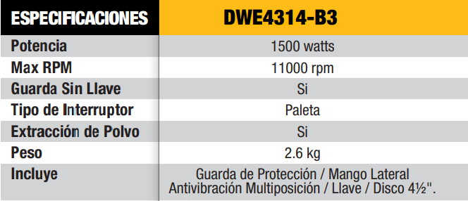 Miniesmeriladora industrial angular uso extra pesado, max potencia 4-1/2in 1500W, 11000RPM